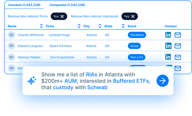 AdvizorPro is built for teams selling into the RIA channel - asset managers, custodians, fintech vendors - who need RIA-specific segmentation instead of generic B2B data. If you're targeting registered investment advisors and you're still pulling lists from a general-purpose database, you're wasting hours on irrelevant contacts that'll never convert.