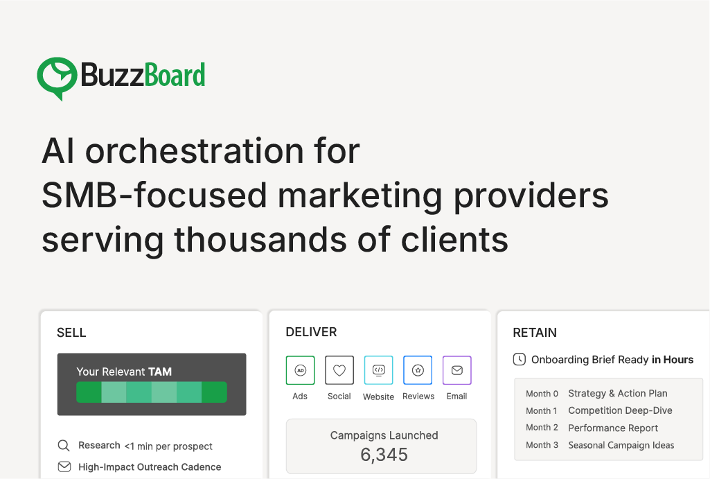 Use this if: You're a marketing agency or service provider managing 500+ SMB accounts and you need AI-generated pitch content, prospecting intelligence, and retention workflows at scale. BuzzBoard's modular approach means you can start with Ignite and add Zylo or Ember as you grow.