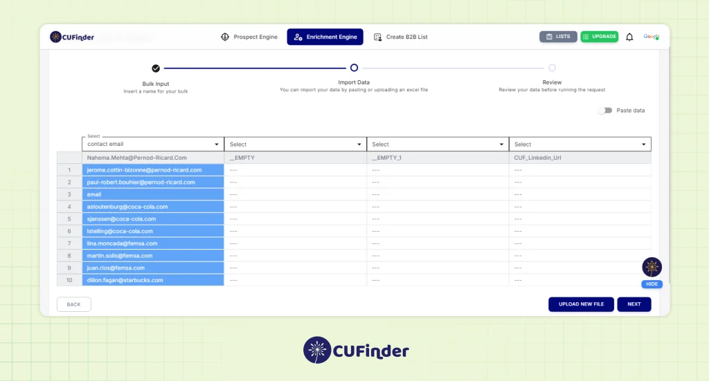 | Integrations | Chrome ext., Google Sheets, CRM | Flat files & API | CUFinder |