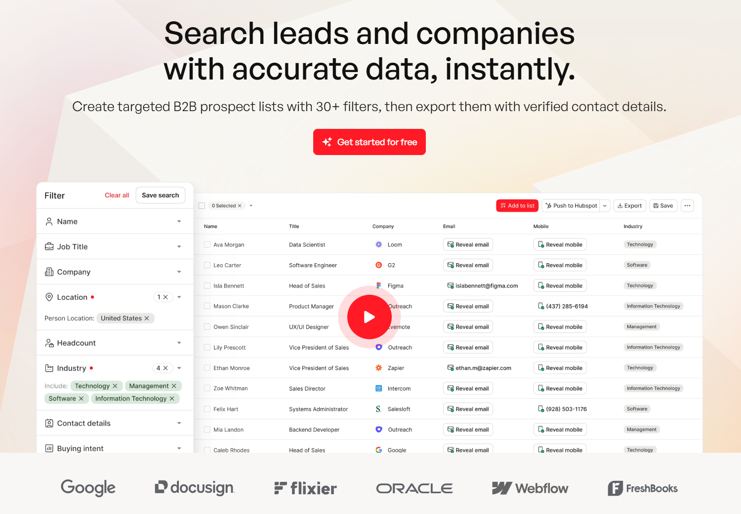 What really sets it apart is the 7-day data refresh cycle. Most competitors refresh every 4-6 weeks, which means you're often working with stale data by the time you hit send. The leads database includes 30+ filters - buyer intent, technographics, job changes, funding - so you can narrow your search before you even start. Pricing is credit-based and transparent, with a free tier of 75 verified emails and 100 Chrome extension credits per month. No contracts, cancel anytime.