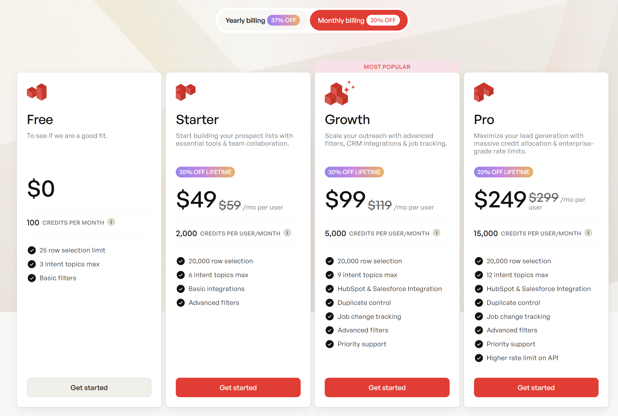 | Plan | Monthly Price | Credits/Mo | Cost per Credit |