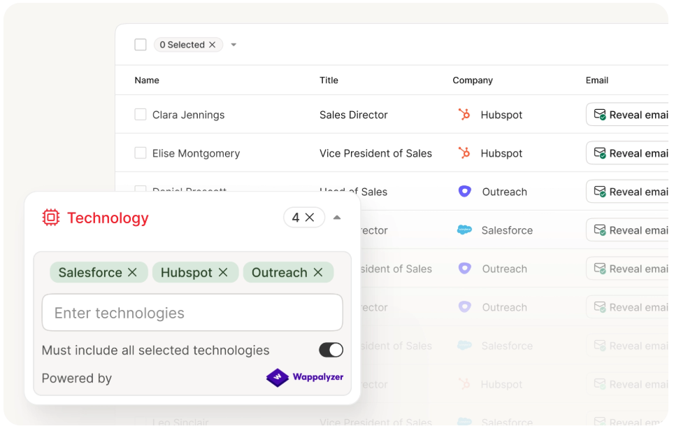 | TheirStack | $59/mo | 32K+ technologies | Job-posting inference | Backend tool detection |